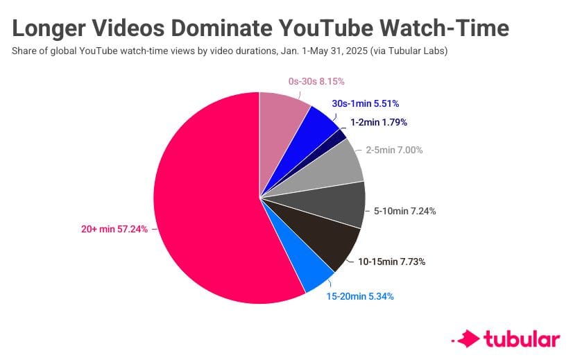 While Shorts have taken over YouTube from a strict views standpoint, watch-time is increasingly guided by videos with durations of 20 minutes or longer. New Tubular Labs data – first shared with Bloomberg – reveals that over 57% of YouTube's minutes watched in 2025 (through May 31) were delivered by videos of 20-plus minutes.