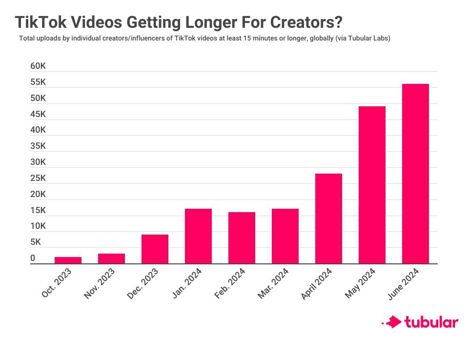 TikTok is primarily known for short-form video. And while that hasn't fundamentally changed in recent months and years, there's also a growing trend where creators are uploading more videos that are at least 15 minutes in length, as new data from Tubular Labs shows.