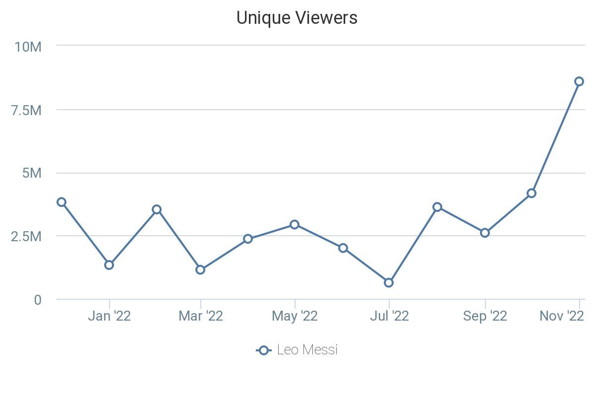 Leo Messi’s social media clout is skyrocketing, hot off the tails of a World Cup Championship. From October to November of this year, the GOAT’s unique viewership more than doubled from 4.2M to 8.6M viewers, according to data from Tubular Labs.