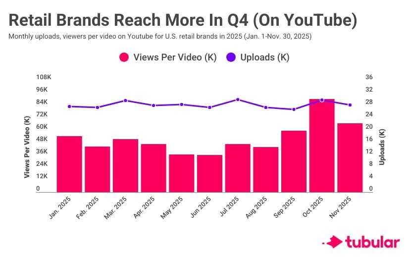New data from Tubular Labs shows how retail reach has soared on YouTube in Q4, especially in October as various stores got a jump on the holiday shopping season. The findings also show a crowded space that opens the door for creator collaborations. [READ MORE]