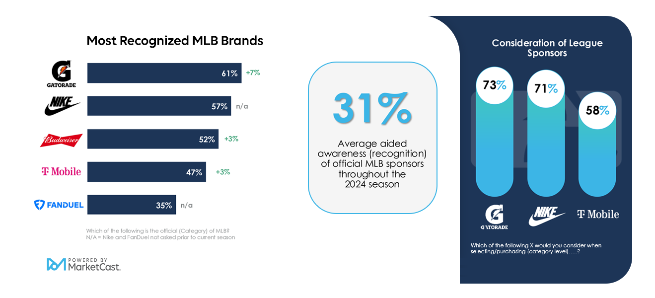 - MarketCast found that sponsors of the MLB net an average lift of +35% pts on consideration. Looking at the top league sponsors, Gatorade and Nike lead at 73% and 71%, respectively, followed by T-Mobile (58%).