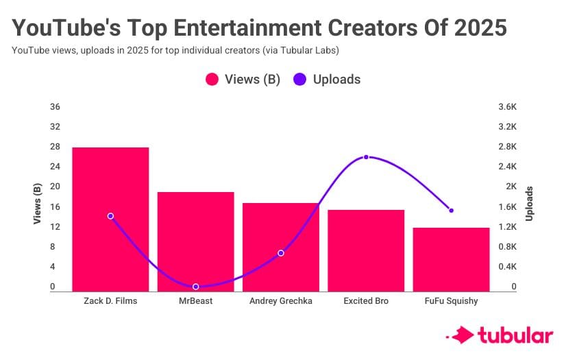 While many of today’s top creators are scoring with upload volume and/or Shorts, MrBeast is doing the opposite on both fronts. Tubular Labs data shows how the video pioneer succeeded while averaging over 200 million views per YouTube upload in 2025. [READ MORE]