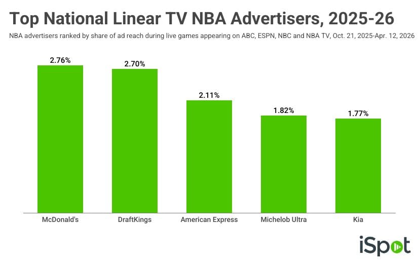 - Data from iSpot shows that McDonald's led the way for TV ad reach during national linear NBA games this season – so live ABC, ESPN, NBC and NBA TV games, but excluding contests appearing on Amazon Prime Video and Peacock.