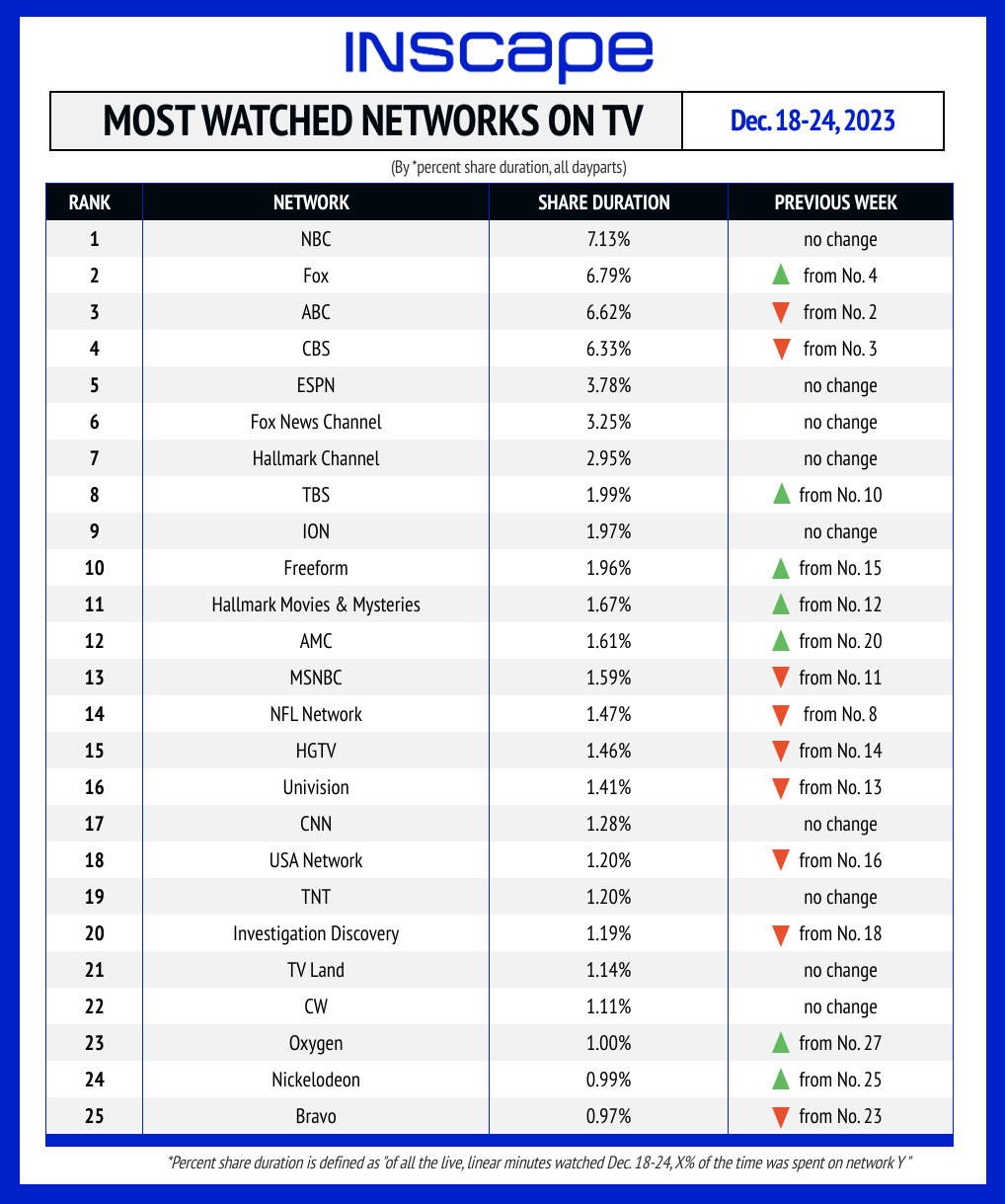 Each week, we highlight the most-watched shows and networks using insights from Inscape, the currency-grade smart TV ACR data provider and data technology division of Vizio. Data is linear, live TV only and includes all episode types (new and reruns). Rankings are by percent share duration (i.e., time spent watching). Here's a look at the top 25 networks by viewership share for December 18-24 — head over to TVREV to see the program ranking and get insights about the top shows by watch-time.