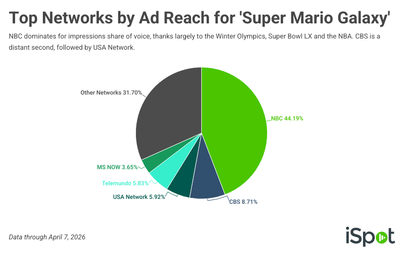 NBCUniversal isn’t just winning at the box office with The Super Mario Galaxy Movie, which premiered in the U.S. on April 1 — it’s also dominating TV ad reach, as NBC’s sports-driven programming has fueled massive scale for the campaign over the last few months.