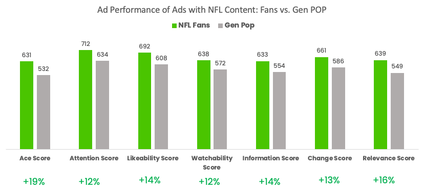 - Looking at 400 NFL ads (excluding network spots) tested from Sept. 1, 2023-Aug. 31, 2024, the average ad featuring NFL content performed 19% higher among NFL fans surveyed vs. the general population audience.