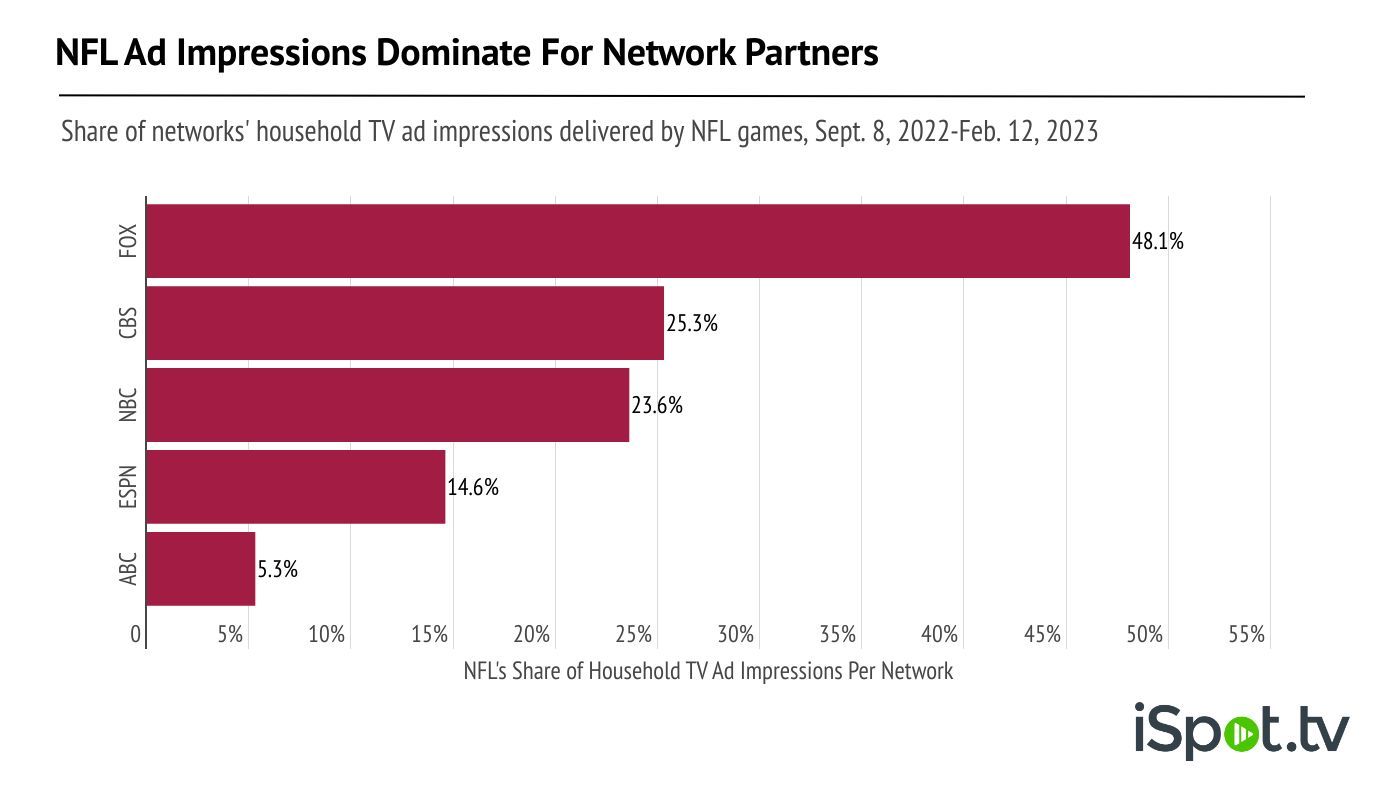 - Nearly half (48.1%) of Fox household TV ad impressions were delivered by the NFL during the 2022-23 regular season and playoffs.