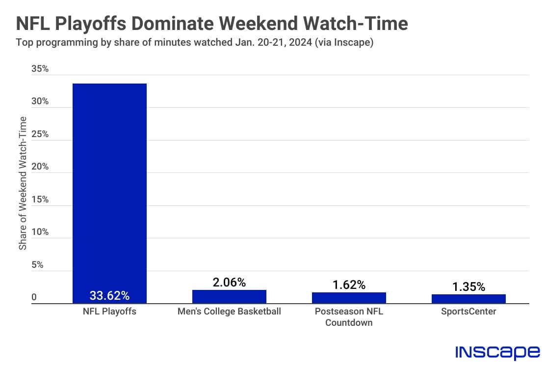 The divisional round of the NFL Playoffs utterly dominated TV viewership this weekend, capturing a 33.62% viewership share across Saturday and Sunday according to Inscape data. That’s an increase from the 2023 divisional round weekend games, which captured a 27.48% share.