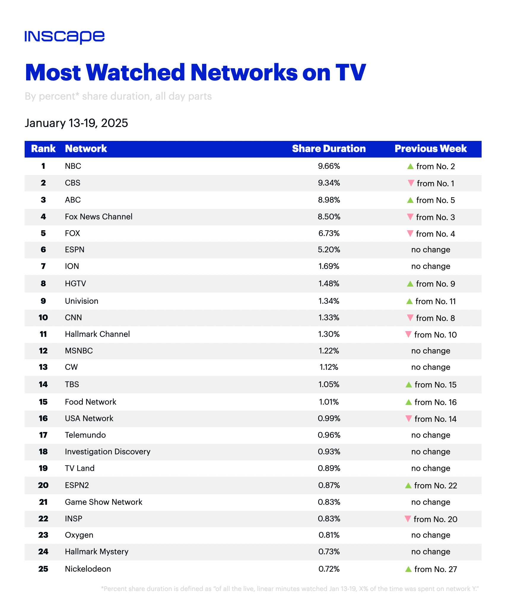 Each week, we highlight the most-watched shows and networks using insights from Inscape, the currency-grade smart TV ACR data provider and data technology division of Vizio. Data is linear, live TV only and includes all episode types (new and reruns). Rankings are by percent share duration (i.e., time spent watching). Here's a look at the top 25 networks for January 13-19 — head over to TVREV to see the program ranking and get insights about the top shows by watch-time.