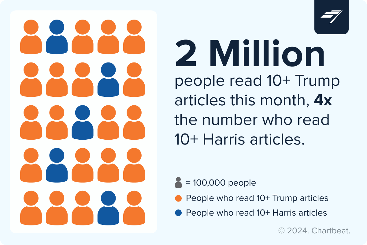 According to recent Chartbeat research around reader behaviors, 2 million people read 10 or more articles about Donald Trump in October – four times the number that read 10 or more articles about Kamala Harris. Why? Well, there's more to it (and more to these audience behaviors beyond just candidate preference):