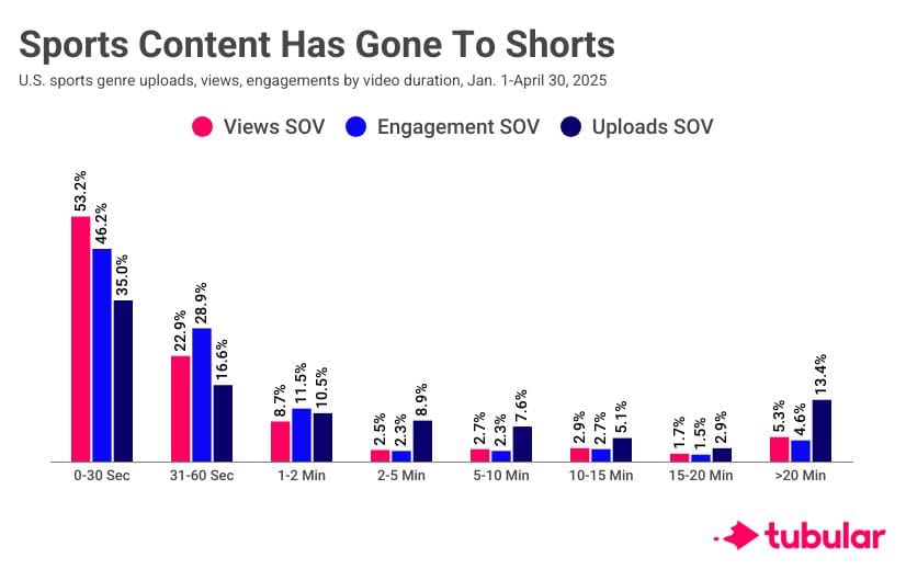 For U.S. sports videos on YouTube, just 35% of uploads in 2025 are under 30 seconds. But at the same time, those videos account for 53.2% of views – according to data from Tubular Labs. Shorts' dominance extends even further when including 31-60 second videos as well: