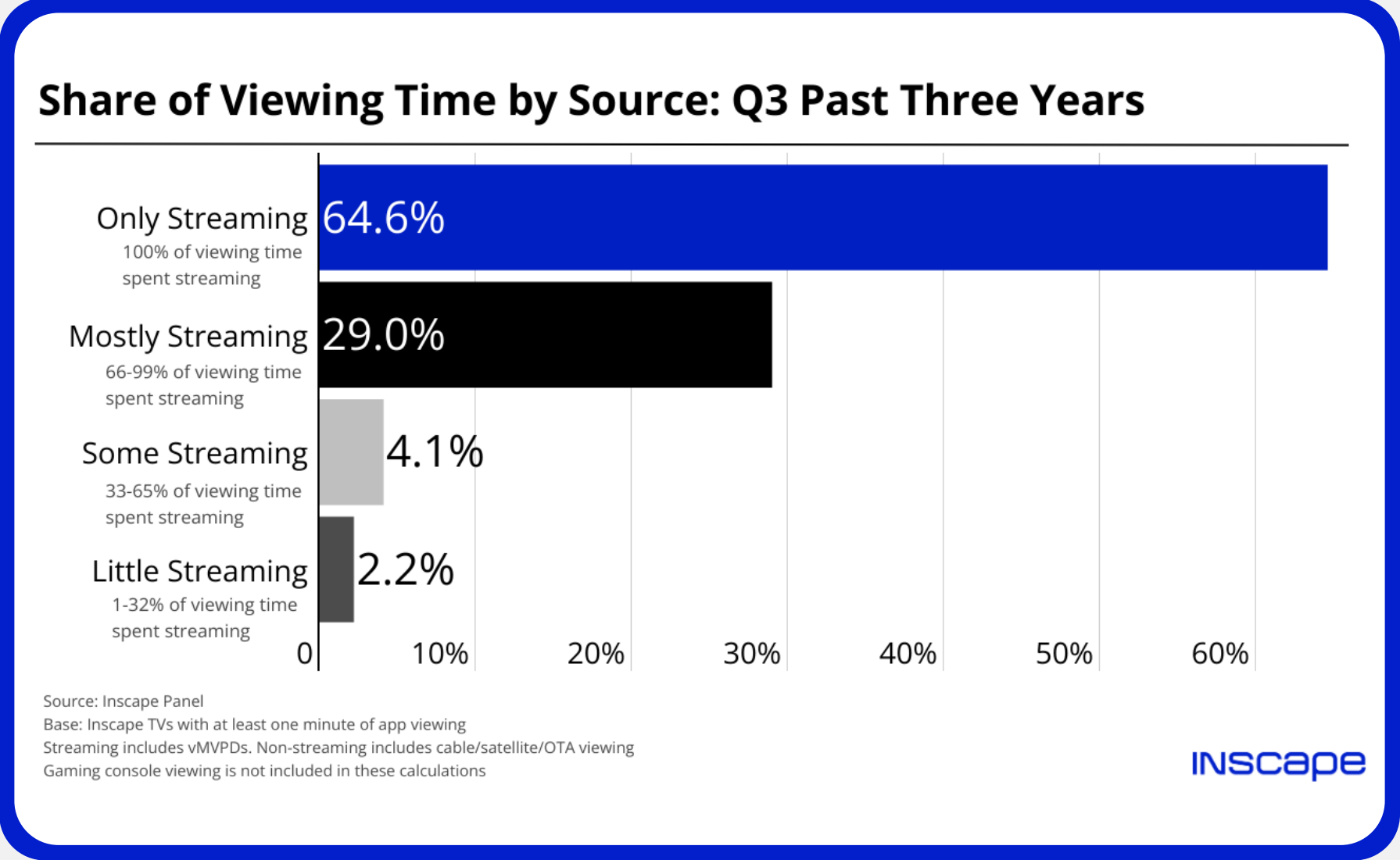 According to Inscape, in Q3 2023, an astounding 94% of total streaming time was driven by viewers who only (64.6%) or mostly (29%) streamed on their smart TVs!