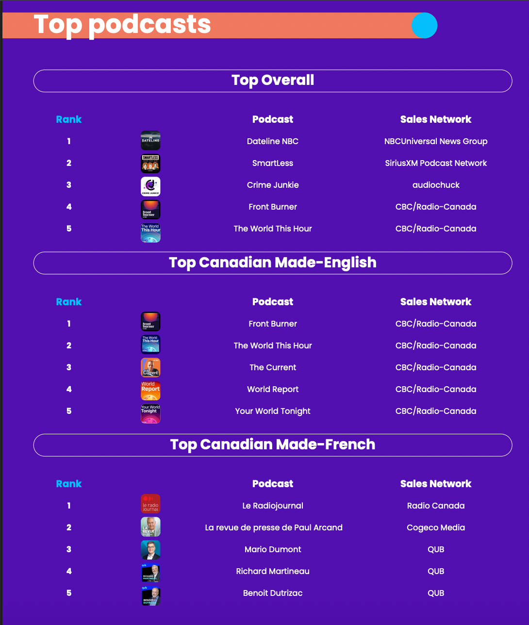 In 2024, the most popular English-language podcast produced in Canada was Front Burner from CBS/Radio-Canada. Le Radiojournal (Radio-Canada) had the most French-language downloads.