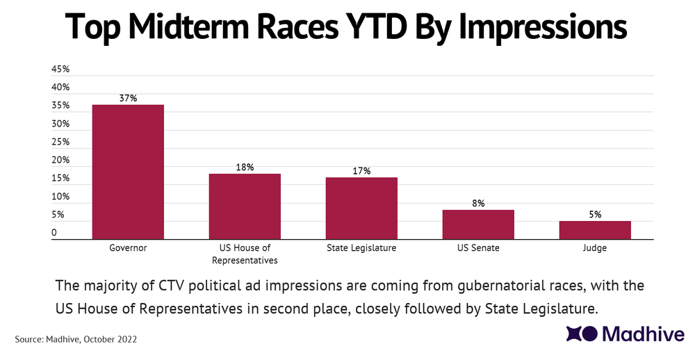 As the midterm elections approach, political advertising is heating up and candidates are on track to shell out nearly $9 billion in ad spend, with $1.5 billion of that going to connected TV. Madhive, a leading tech company in the TV advertising space, recently examined current political advertising trends and discovered that average daily political impressions on connected TV are up 96% in October vs. September this year.
