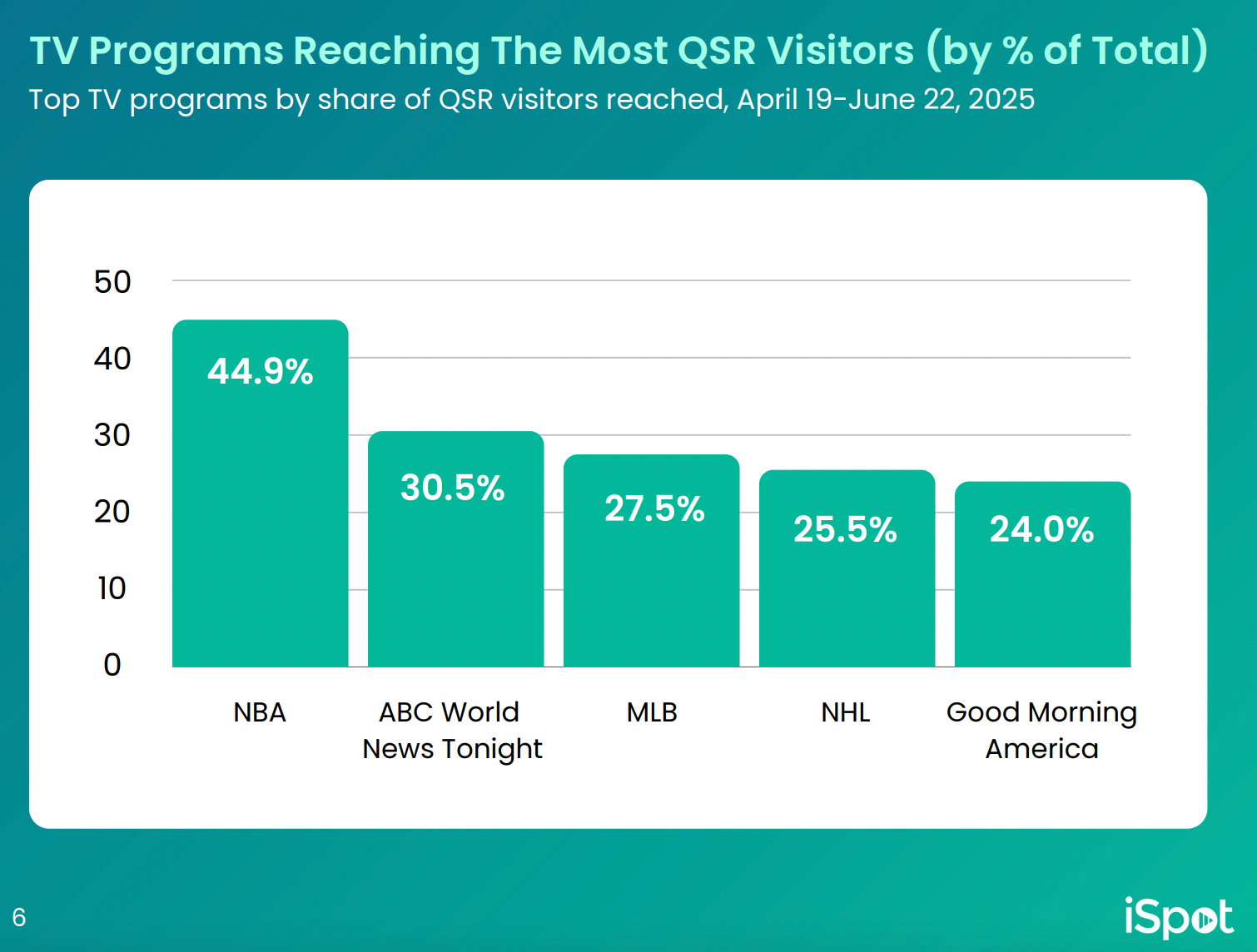 - During this year’s playoffs, NBA games reached 44.9% of QSR visitors — most of any program on TV in that time (among the top 50 networks).
