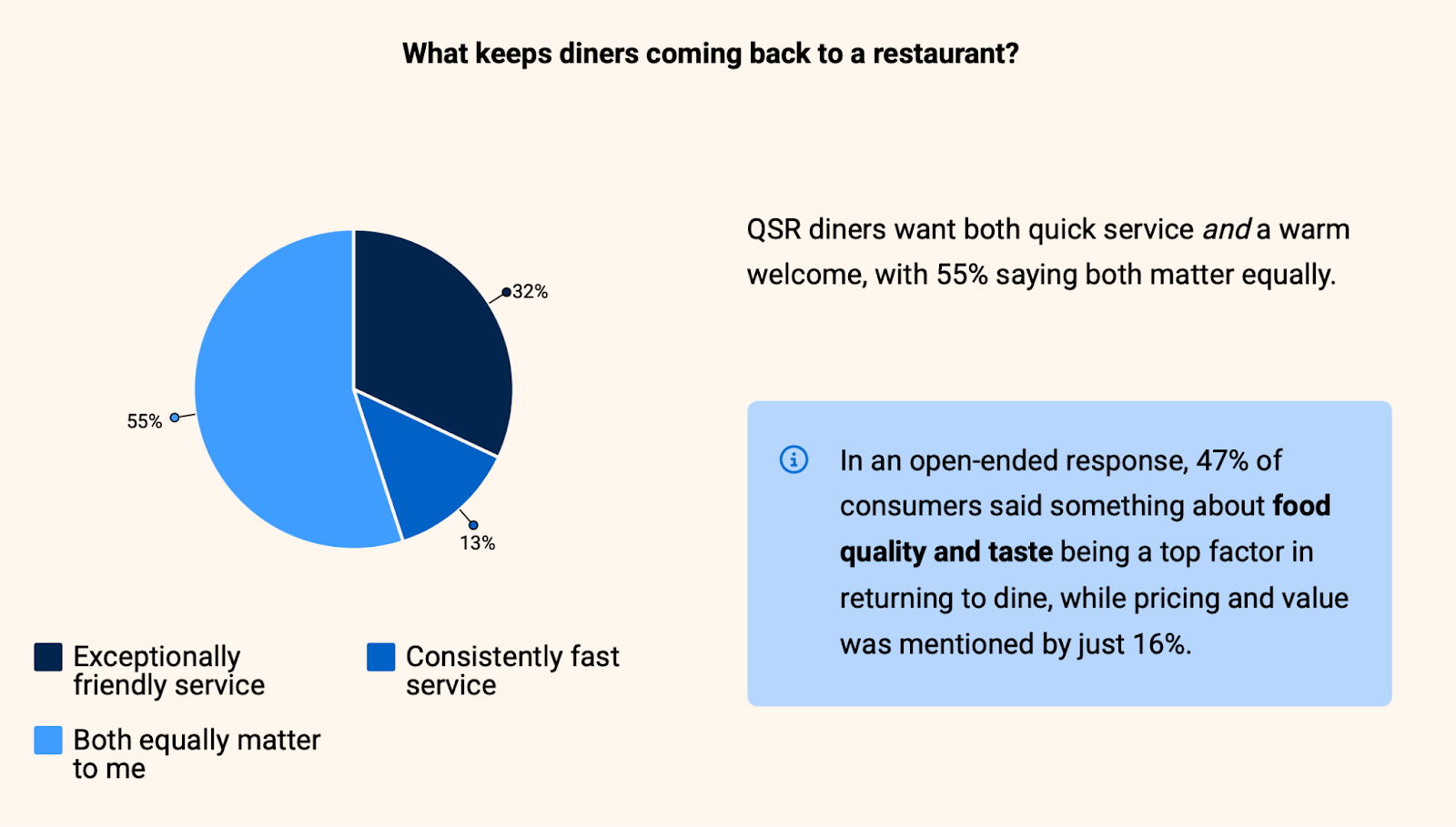 - Food quality was mentioned by 47% as the biggest factor in returning, while pricing/value was cited by 16% — while top deal-breakers include unclean environments, rude staff and poor food quality.