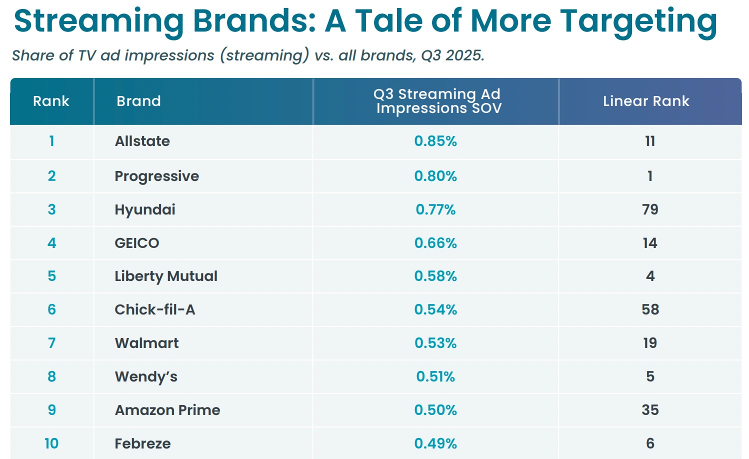 iSpot’s new Unified TV & Video Ad Snapshot highlights Q3's top brands by streaming ad impressions SOV; a list that looks distinctly different when compared to top linear advertisers. A key factor there is streaming's targeting capabilities, increasing its significance for industries like QSR and autos. [READ MORE]