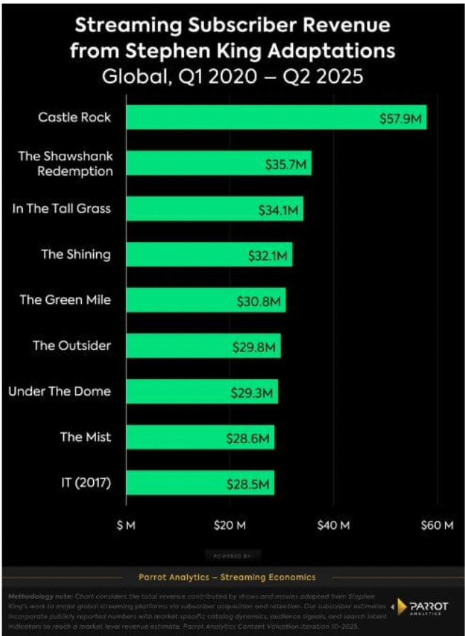 Stephen King adaptations generate significant demand and revenues for streaming services, as data from Parrot Analytics showcases. Since Q1 2020, Castle Rock leads among King properties, while demand looks high for Welcome to Derry. [READ MORE]