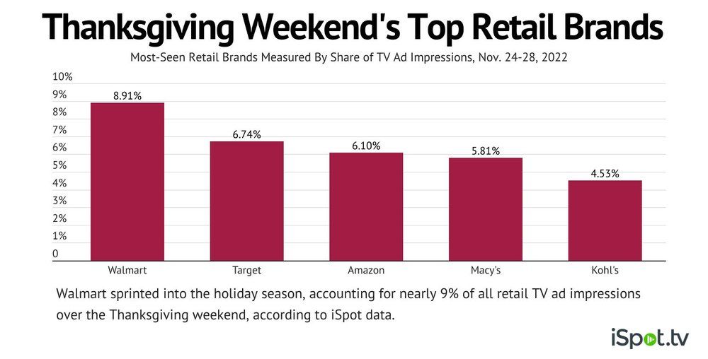 - Of course, football played a big role for retail brands over Thanksgiving — the NFL accounted for 12.89% of TV ad impressions, while college football was No. 2 with 3.85%.