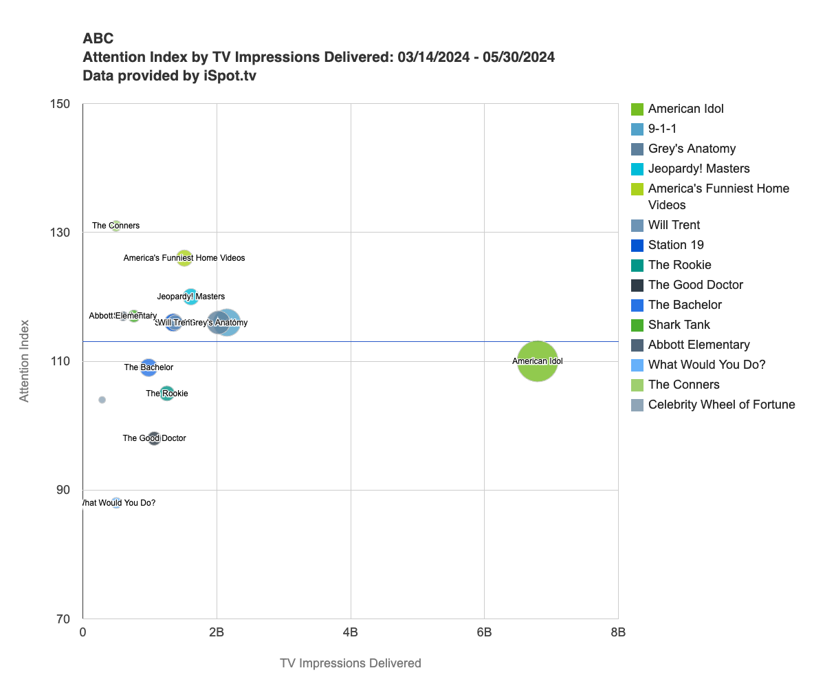 - Since Mar. 14, ABC's primetime slate saw just three live programs deliver more than 2 billion household TV ad impressions – American Idol, 9-1-1 and Grey's Anatomy. Grey's and 9-1-1 both saw 16% higher attention than the norm in that stretch, while Idol was 10% above.