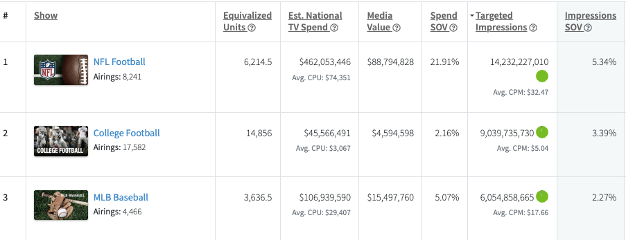 NFL, NCAA and MLB accounted for 11% of all ad impressions and 30% of all spending on TV this week according to iSpot