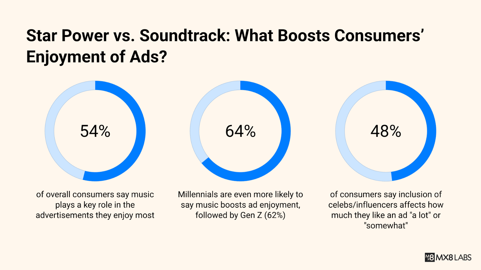 More than half of consumers say music plays a key role in the ads they enjoy most, MX8 Labs found.