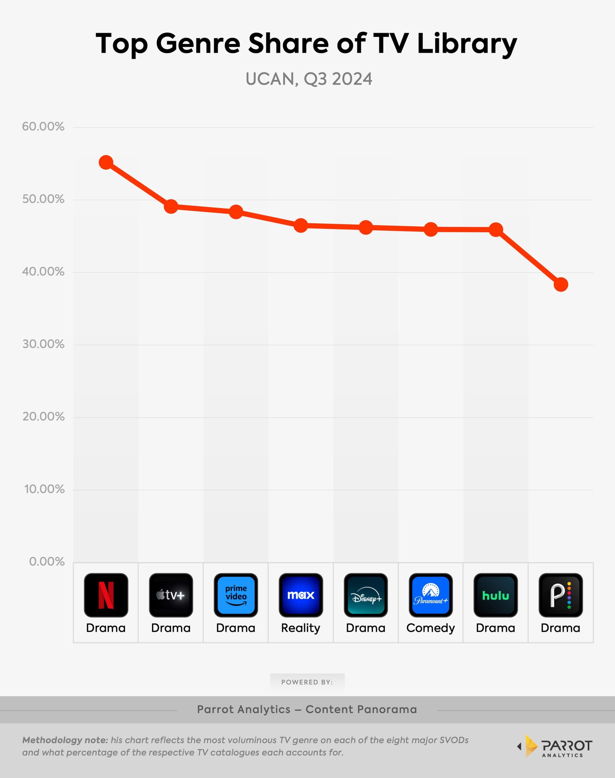Data from Parrot Analytics shows how in Q3 2024, nearly ever major U.S./Canada streaming service had drama as its top genre – and. most times at over 35% of its entire TV library.