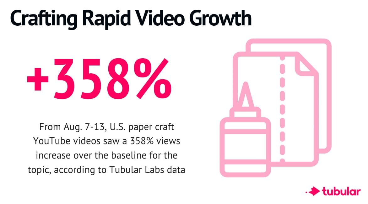 - Paper craft videos amassed 58.3 million views in the last seven days – a 358% increase over the baseline for the topic (No. 1 among all video topics over the last 30 days).