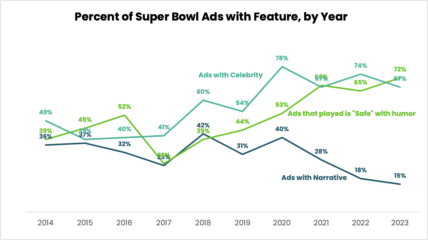 - Since 2020, Super Bowl ads with a narrative focus (as measured by verbatim responses from iSpot's Creative Assessment Survey) have seen a sharp decline from 40% to just 15% in 2023.
