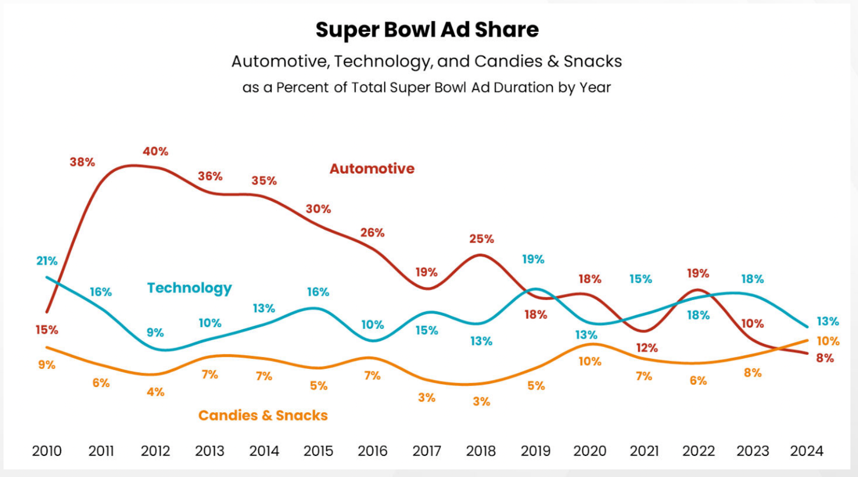 - Candy & snack brands were another big winner during Super Bowl LVIII, accounting for 10% of ad duration, which was up from 8% in 2023 and 6% in 2022.