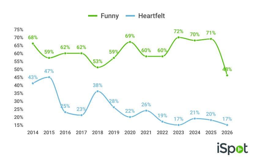 - "Heartfelt" ads have been on a downward swing in recent years, after trending closer to funny ads in 2014, less than a quarter of ads have scored for heartfelt ever year since 2022.
