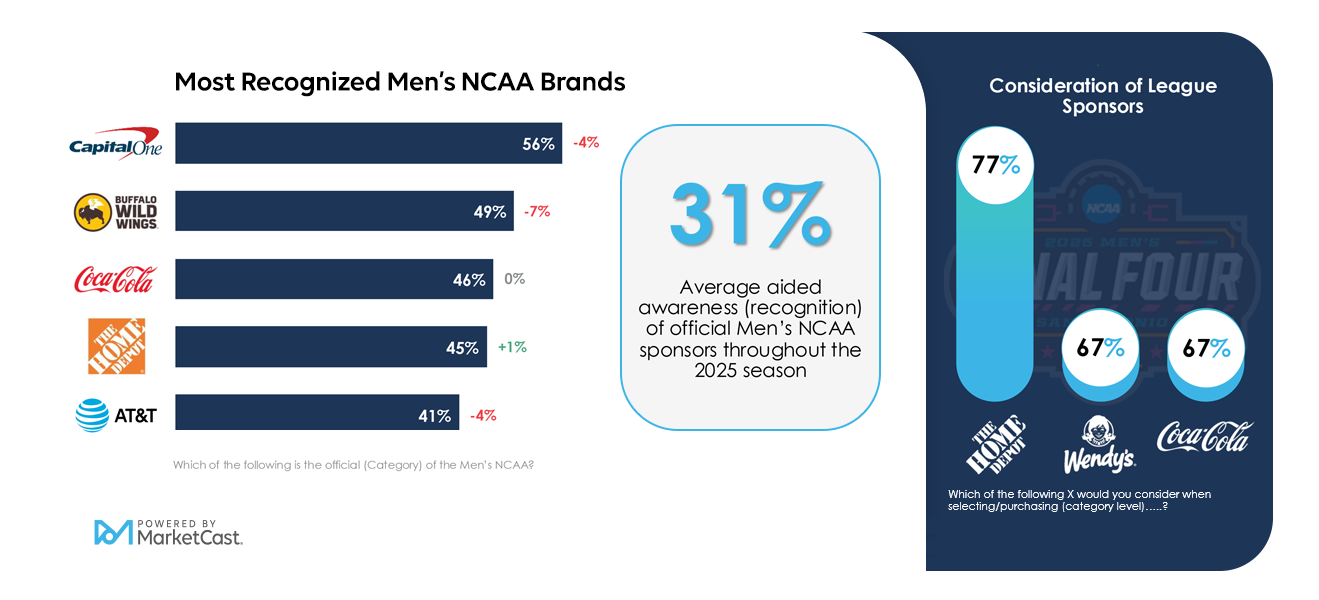 - The most recognized ‘25 sponsors among men’s NCAA basketball fans were Capital One (56%), Buffalo Wild Wings (49%) and Coca-Cola (46%).