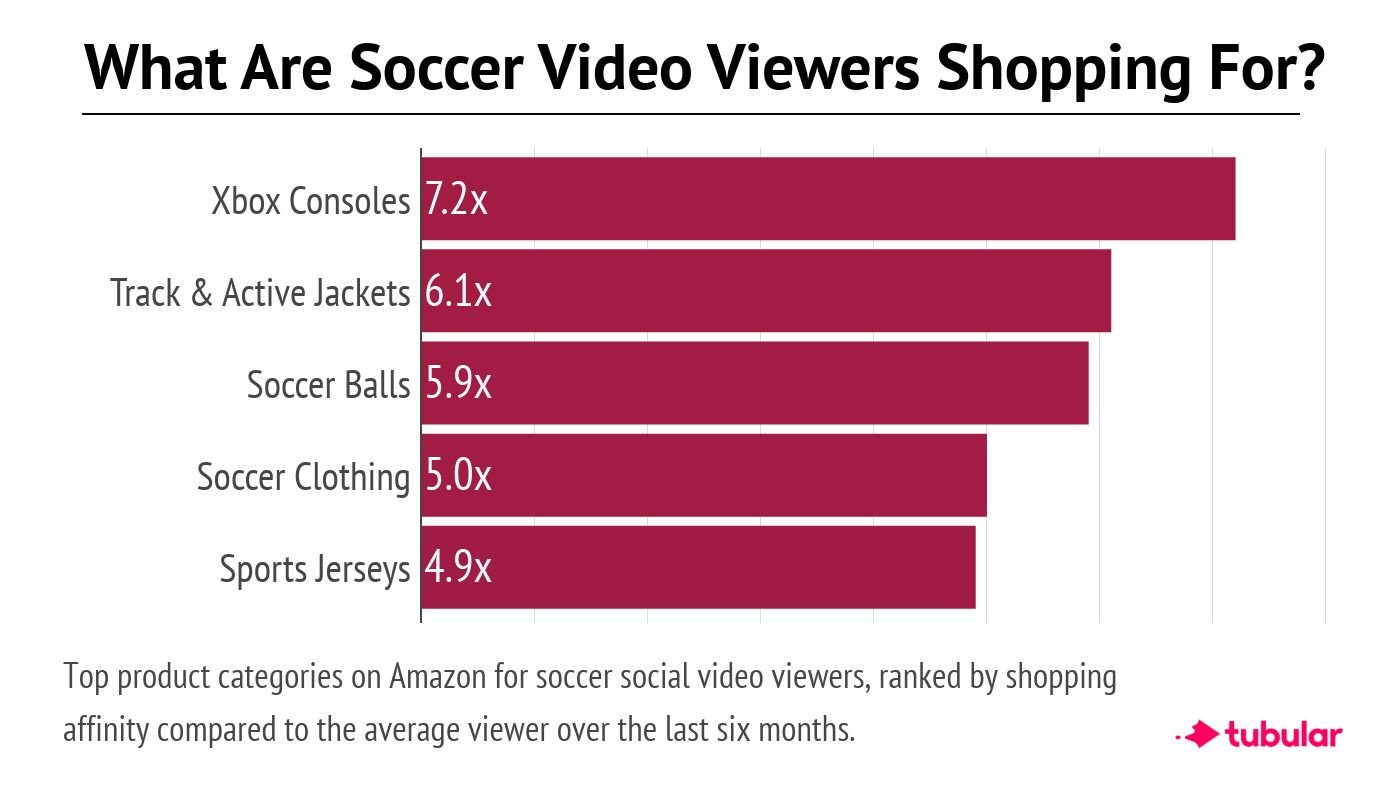 With the World Cup just days away, Tubular Labs shares data around what soccer social video viewers are shopping for most (which may perhaps give glimpses into the types of brands that should activate around the World Cup’s TV and digital content). Chief among them? Xbox, which leads the way below by Amazon product category, at least in part due to interest in the EA Sports FIFA video game title.