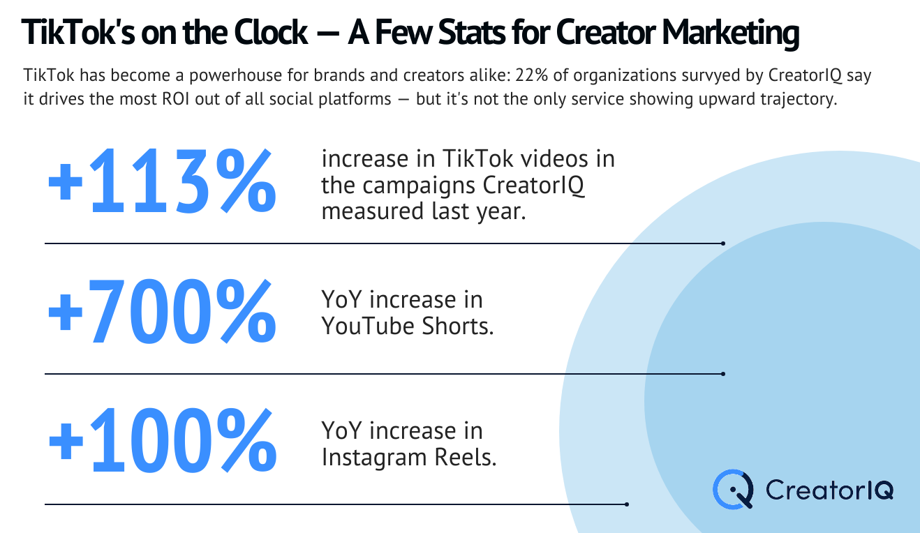 - There was a 113% increase in TikTok videos in the nearly 20,000 campaigns CreatorIQ tracked last year, and 22% of organizations surveyed said TikTok drives the most ROI out of all social platforms.