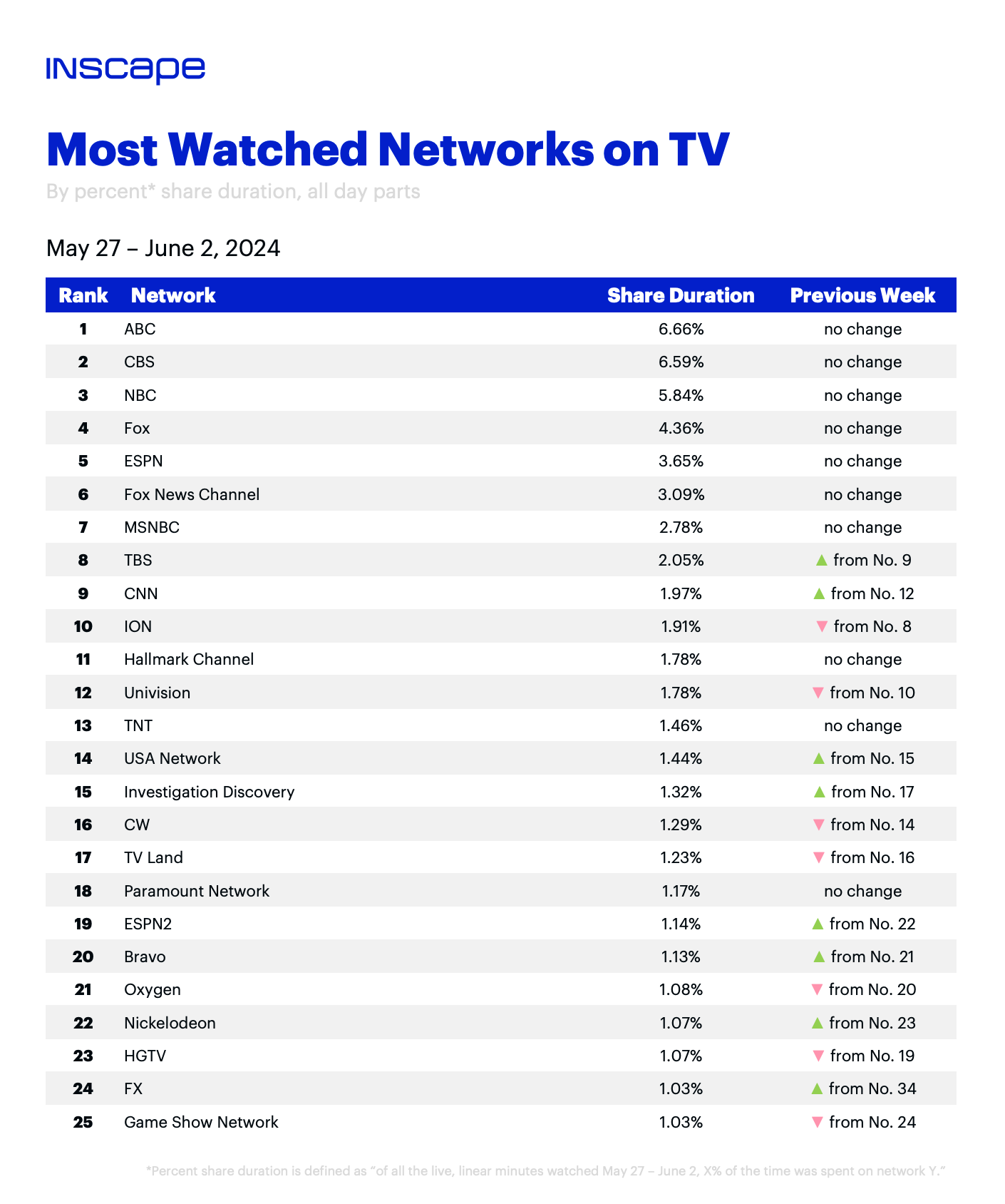 Each week, we highlight the most-watched shows and networks using insights from Inscape, the currency-grade smart TV ACR data provider and data technology division of Vizio. Data is linear, live TV only and includes all episode types (new and reruns). Rankings are by percent share duration (i.e., time spent watching). Here's a look at the top 25 networks by viewership share for May 27 through June 2 — head over to TVREV to see the program ranking and get insights about the top shows by watch-time.