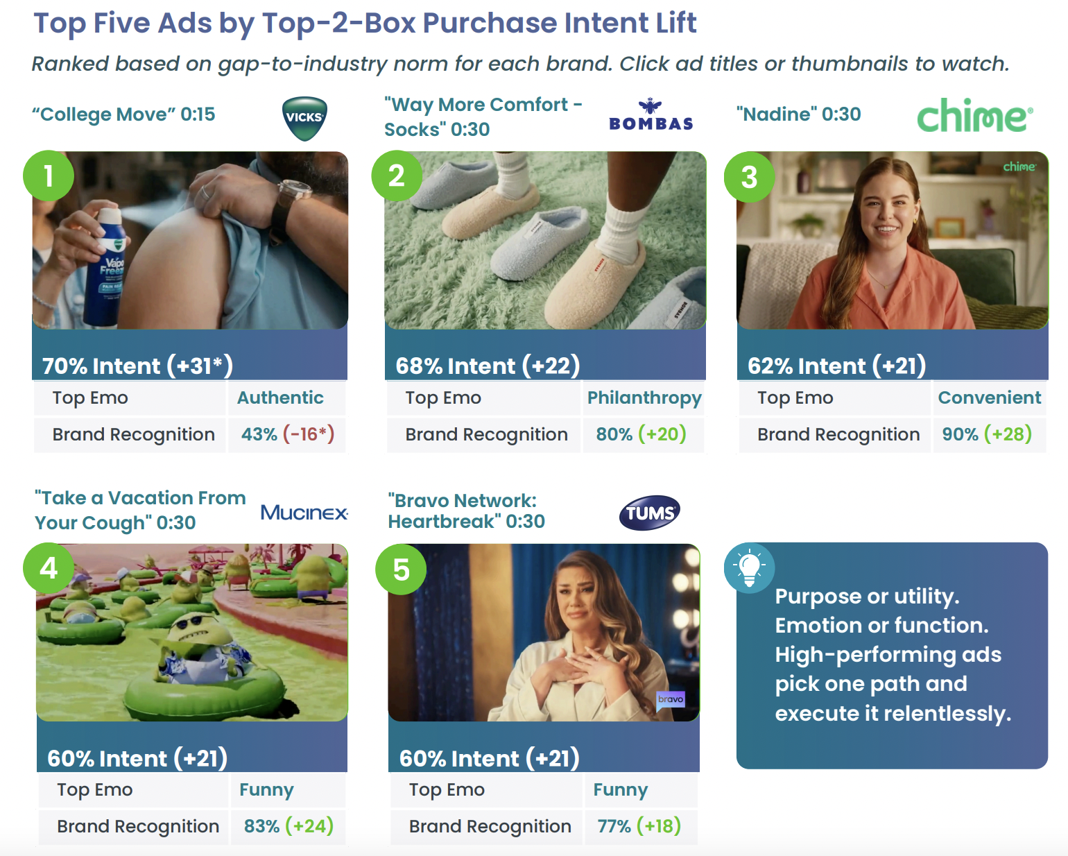 - Two key themes among the top ads by positive purchase intent: Brand-purpose storytelling and focused ads that broke through with humor and/or utility.