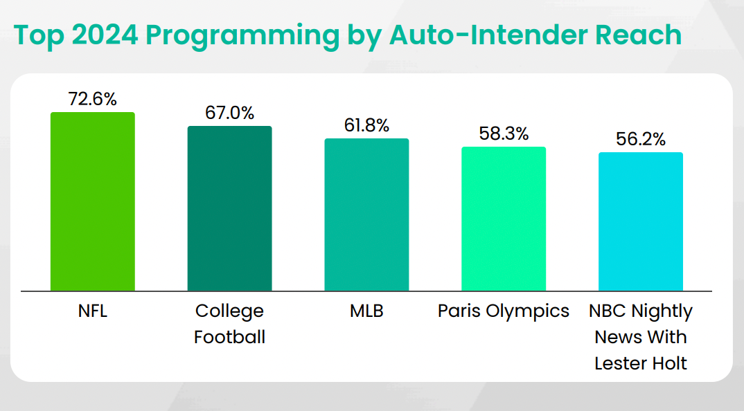 - At the same time, though, the data also shows where there are missed opportunities: NBC Nightly News With Lester Holt was No. 5 by auto-intender overlap (56.2%), but just 88 automaker ads aired during the program in 2024.
