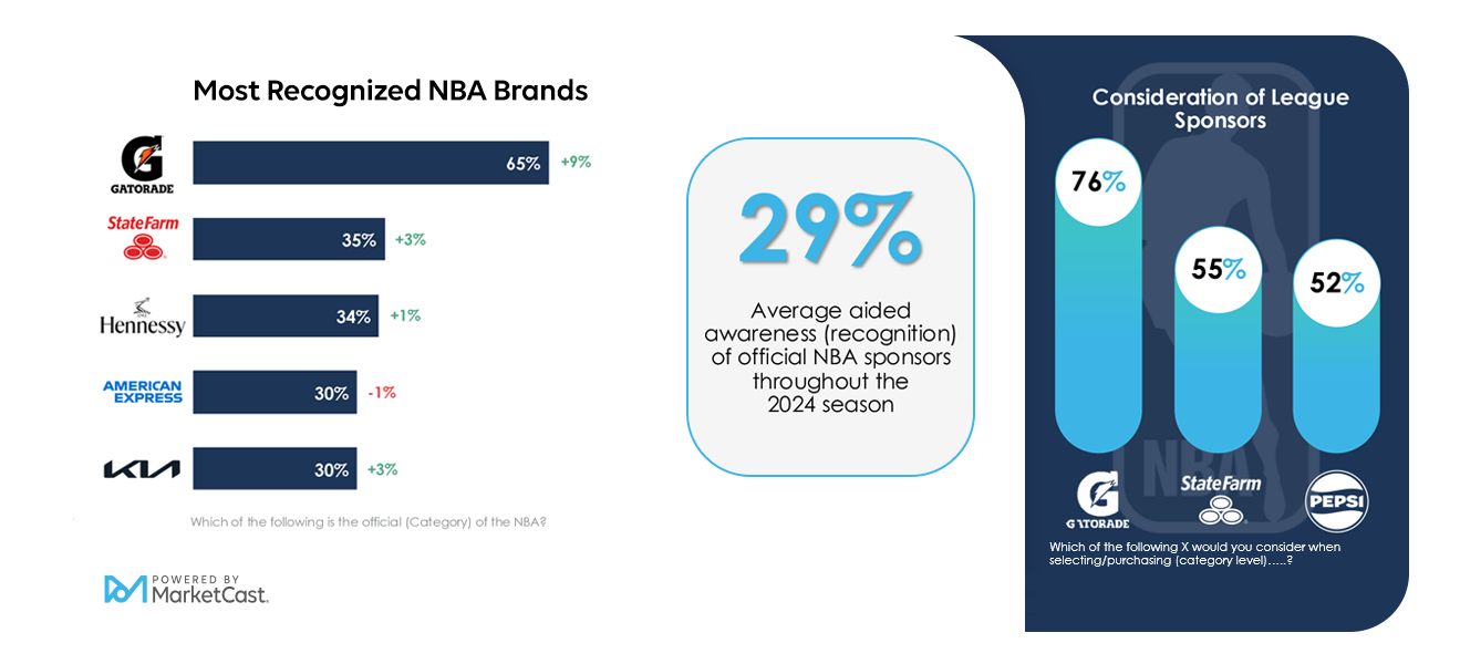 - Looking at the 2024-25 NBA season, official league sponsors averaged 29% aided brand awareness. Gatorade, the NBA’s longest standing sponsor, remains the top brand recognized by NBA fans (60% aided awareness).