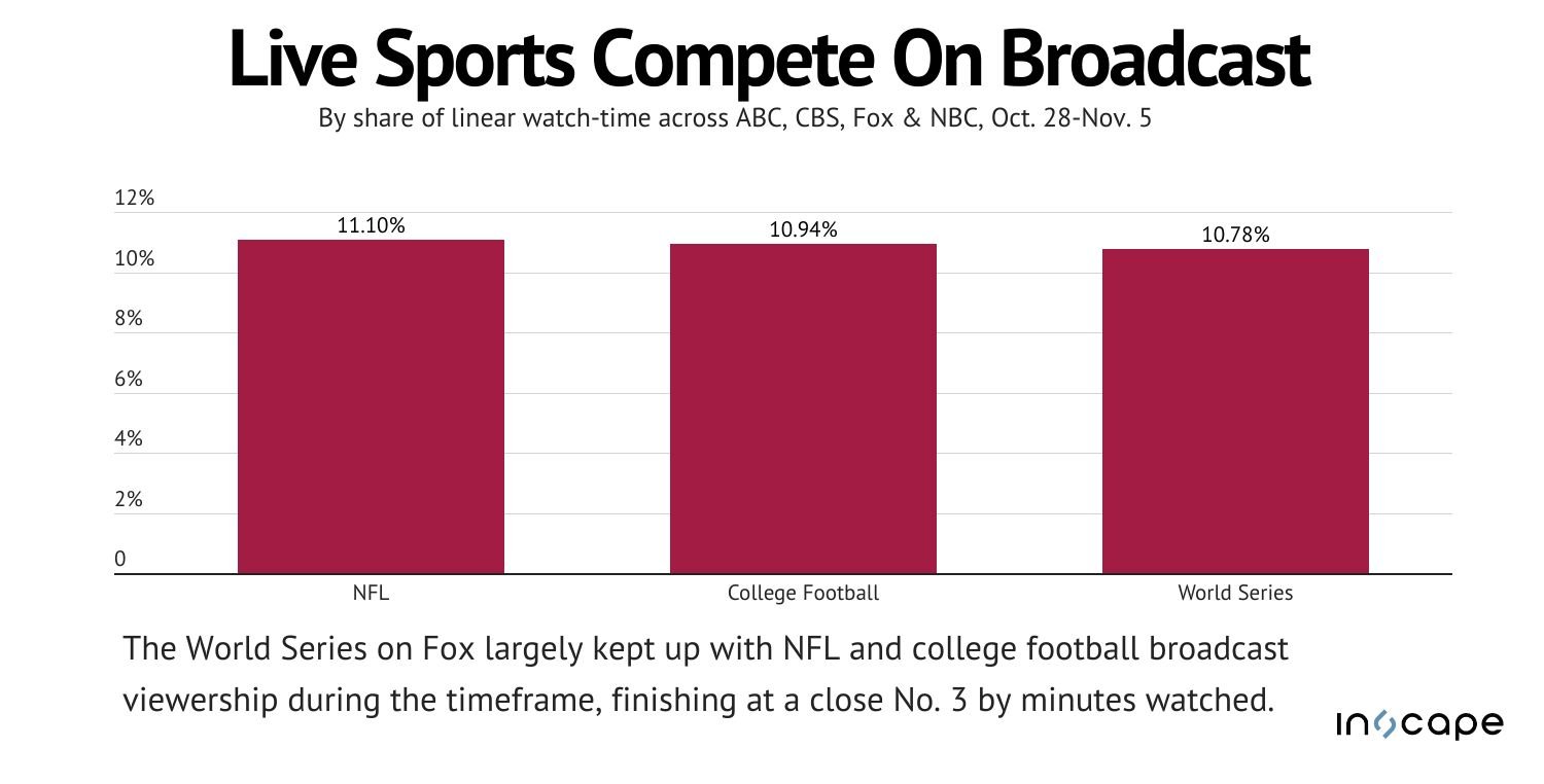 While football owns the fall, this year’s World Series still managed to compete for eyeballs across broadcast networks. Data from VIZIO’s Inscape shows that from Oct. 28-Nov. 5 the World Series accounted for 10.78% of minutes watched across ABC, CBS, Fox and NBC. That barely trailed the NFL (11.1%) and college football (10.94%) despite more games for those sports in the timeframe.